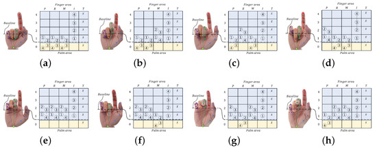 This means that all four joins of the middle, ring, and pinky fingers have to be physically located below joint “2” of the index finger. When the index finger (I) behaves as a straight line and all four joints are located in four individual cells in the vertical direction, all three fingers (M, R, and P) are located based on I1 and the cell below , as shown in , and each of the three fingers is shifted to one upper cell from left to right, as shown in , , and . Upon shifting all of the bent fingers up by one cell to , to show the hand pointing with three bent fingers located below . All four joints of the three fingers (M, R, and P) are located at the same level as and , as shown in . Each of the three fingers, “middle, ring, or pinky”, in is shifted down one cell to form the other three patterns of , , and , respectively. These are the possible patterns of hand pointing that are used to recognize and confirm the hand pointing shape in this paper.
