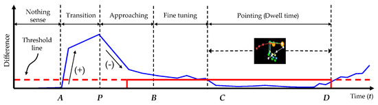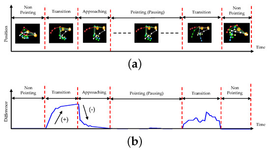 On the other hand, the hand posture must pause for a time in the second condition of the hand pointing mode. If we analyze the movement of finger joints in a video sequence, then the finger joints in a pointing pattern and other patterns are shown in the video sequence, as shown in the example presented in Figure 8a. If we simply differentiate consecutive frames, the results may indicate differences during non-pointing, transition, and approaching durations and no difference during pause durations, as shown in Figure 8b. Therefore, this paper proposes identifying the candidates of the hand pointing mode by detecting the first frame of the pause duration, performing pattern matching with the first frame and each of the eight trained patterns, and confirming that the hand pointing vector is located in the SOI. When the hand pointing mode is confirmed, the closest point between the eye gaze and hand pointing vectors is then obtained as the POI.