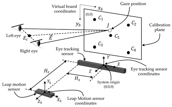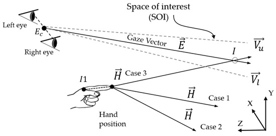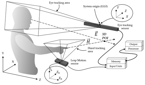 The origins of the coordinates of the eye tracker (X, Y, Z) and Leap Motion sensor (, , ) are located in the center of each sensor and, in practice, the coordinates of the hand tracking area are initially calibrated to the coordinates of the eye tracking sensor. In testing, the eye gaze () and hand pointing () directions are detected by the eye tracking sensor and Leap Motion sensor, respectively. The 3D POI is geometrically found at the crossing point between the hand-pointing and eye gaze directions.