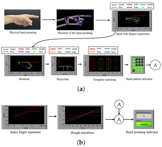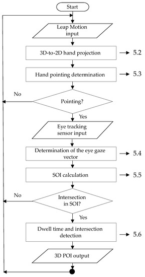 Based on the established hardware, our software unit starts with the Leap Motion input process, which senses the finger joint positions with the Leap Motion sensor, as shown in Figure 11. The unit then projects the 3D finger joint-position data to 2D data in the 3D-to-2D hand projection process and detects hand pointing in the hand-pointing determination process. Section 5.2 and Section 5.3, respectively, describe these processes. In the case in which the hand is not determined to be in pointing mode, the system does not process further and it goes back to the Leap Motion input process. If the system decides that the hand is in pointing mode, the eye gaze is input from the eye tracker in the eye tracking sensor input process, the eye gaze vector is determined in the process of determination of the eye gaze vector, and the SOI is calculated in the SOI calculation process, which are processes introduced in Section 5.4 and Section 5.5, respectively. At this time, if the vector of hand pointing intersects the SOI, then the system is confirmed to be in the pointing mode. The system then finds the closest 3D point between the vectors of eye gaze and hand pointing, which is assumed to be the POI. The details of the closest-point calculation are reported in Section 5.6. Otherwise, the system returns to start the loop again, with new finger joint positions being obtained by the Leap Motion sensor.