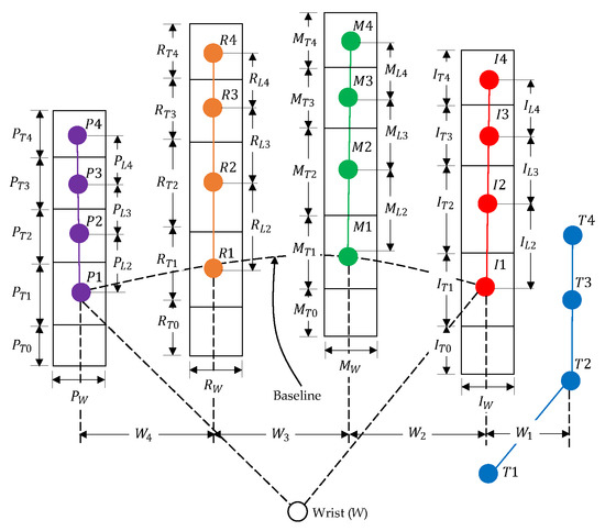 On the other hand, the ranges between neighboring finger joints on the baseline (–) are measured according to the coordinates from the hand motion, and the width of the template cells (, , , and ) can be calculated by the following equations: