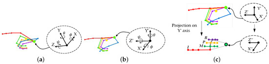 The finger joints of the five fingers of the hand, as shown in Figure 14a, are then rotated to the desired angle, as shown in Figure 14b. Now, the hand angle is ready to detect all of the finger joints, assuming no occlusion, and this is a good angle at which to project [48] the 3D position (, , ) onto the 2D (, ) position by the following Equation (19), as shown in Figure 14c.
