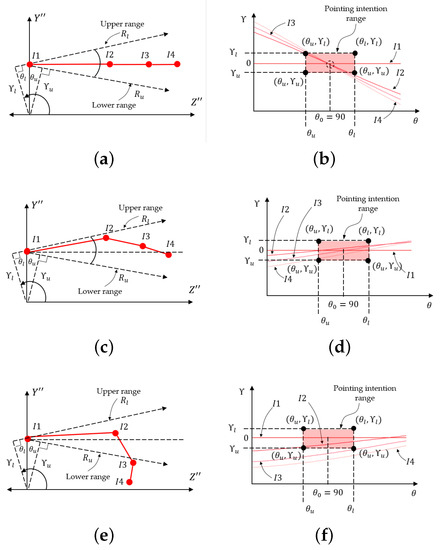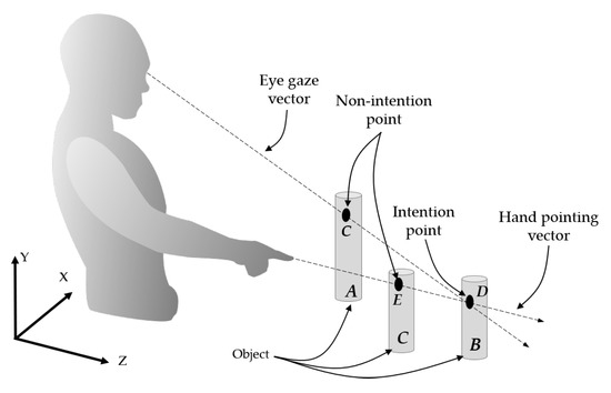 Future facilities in vehicles and environments of humans, such as homes, working offices, hospitals, production factories, and cars, tend to be smart and friendly for humans [15]. For instance, remote control using human gestures at a smart home, virtual switching for commanding robots in a smart office, hospital, and production factory, gesture-based navigation for a driverless car, etc. These functions basically work based on communication between humans and machines, called human-machine interfaces. Flexible and convenient interfaces using hand pointing and eye gazes as useful combined gestures for remote control are required for switching between intention and non-intention modes to facilitate communication between humans and machines in future vehicles and environments. Normally, humans perform their gestures, such as pointing and watching at an object called the intended point for intention expression on the object. In practice, intended points that are allocated on two-dimensional (2D) screens can be detected by pointing and gazing in an area of interest (AOI) on a virtual screen, and the AOI is simply classified by the area ratio on the virtual screen [16]. This may not be matched with an intended point in a three-dimensional (3D) space, since the AOI size is gradually changed based on the distance from eyes to the object.