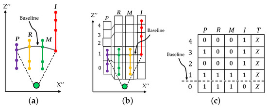 Regarding the first condition of static finger gestures, while the thumb is free as the don’t-care term, the index finger absolutely needs to be a straight line in the pointing gesture, and the pinky, ring, and middle fingers have to be bent inward. Although these three bent fingers are slightly varied in vertical direction in reality, the bent fingers that represent hand pointing can be concluded in some patterns, which will be discussed in detail in the next subsection. If we set up rectangles to cover all of the finger joints and tips, with the tips and joints being located in the center of the rectangle, a template consisting of rectangular cells can be obtained, as shown in Figure 5b. In some cases in which the fingers are bent inward lower than the baseline, other cells (, , , and ) are established to cover some possible patterns of the fingertips of bent fingers. Finally, if we informatively assign the logical “1” as a hand and “0” as no hand in the cells of the matrix, the pattern of the hand pointing template is obtained, as shown in Figure 5c.