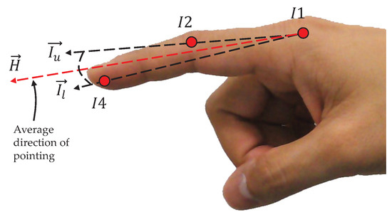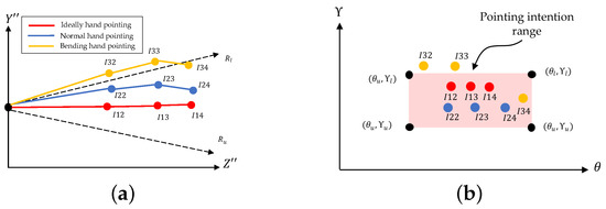 A hand shape can basically be represented based on finger joints as a feature [20], a gesture of hand pointing can be established as a hand shape pattern in a still image, and humans naturally pause their hand posture in a pointing pattern position for a period of time during pointing [43]. This paper analyzes the hand pointing mode, considering two parts as necessary conditions: static finger gestures and the hand posture during pointing. The hand pointing mode is used to switch the mode of the intention estimation. Suppose that a fingertip and four joints of each finger can be detected by a sensor [44], as shown in Figure 5a, which are , , , , and . Physiologically, the first joints of all fingers (, , , , and ) are fixed without any movement, and a line passing those joints can be assumed to be a baseline for considering the movement of other finger joints.