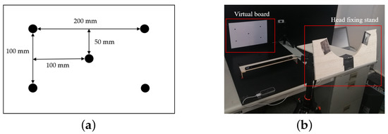 There are three coordinate systems: those of the eye tracker (X, Y, Z), hand tracker (, , ), and virtual board (, ), as shown in Figure 12. In practice, users have to calibrate these three coordinate systems to find connection the virtual board and hand tracker coordinates with the coordinates of the eye tracking sensor in advance. The eye tracking sensor is assumed to obtain the coordinates of the left and right pupil centers and the 2D eye gaze position on the virtual board. In the calibration, a board with some points that represent the priors of the measured 3D position (–) on the eye tracker coordinates is temporarily installed, and the 2D coordinates of those five points on the board [46] (–) are the outputs from the eye tracking sensors when an examiner looks at those five points. The conversion between the 2D virtual board and 3D eye tracking sensor coordinates is performed with the following equations: