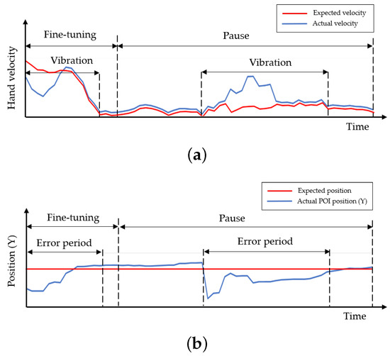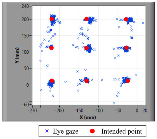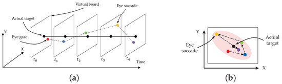 For the second error group of multimodal-fusion-based 3D POI determination according to the experimental results presented in Table 4, the eye gaze is ideally concentrated on a target of 3D POG. In reality, eye saccades always occur, and they cause errors in eye gaze tracking, as shown in Figure 30b. In the time domain, the eye gaze vibrates around the POI, as shown in Figure 30a, and these become errors that are caused by saccades within a range, as shown in Figure 30b. This should be considered statistically in solving this problem in future work. In addition, the hand pattern matching performed well in the experiments, as shown by the results presented in Table 2, because all of the participants were trained appropriately before the experiments. Users are recommended to be trained before testing to avoid errors in hand pattern matching in real applications.