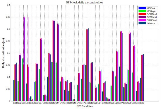 Although all ACs and IGS adopt special techniques to achieve continuous satellite clock estimates, discontinuities still emerge at the day boundaries of GNSS precise products, whether GPS-specific or mixed MGEX products. These discontinuities are usually used as a standard to evaluate the quality of satellite clock products [42]. Statistical comparison of the average absolute values of discontinuities in five GPS-specific clock products and three Galileo-specific clock products during 10 days (MJD 59029 to 59037) clearly illustrated the problem of discontinuities in different products. Due to the perfect processing strategies adopted by IGS and ACs, the combined GPS clock daily discontinuities are very small. Thus, the daily discontinuities in GPS clock products are calculated as the difference between the final epoch of the last day and the first epoch of the next day. For most Galileo clocks, the clock stabilities are excellent, so the daily discontinuities are between the average absolute value of the last 5 min of the last day’s epochs and the first 5 min of the next day’s epochs. Due to the GBM Galileo clocks’ problems during the study period, we did not consider GBM clock products. Figure 1 and Figure 2 describe the daily discontinuities in GPS-specific clocks and Galileo products, respectively. As shown in Figure 1, the daily discontinuities in GPS combined IGSFinal and IGSRapid products are all within 0.10 ns for most GPS clocks, except for G01,G03, G10, G11, G27, and G28. Such discontinuities in these GPS clocks should be ascribed to clock instability and solution noise. However, the daily discontinuities in CODFinal, GFZFinal, and GRGFinal products were previously larger, and their amplitudes are nearly the same: within 0.25 ns for most GPS clocks, except for G03, G07, G10, G11, G18, G27, and G29. For comparison, we also calculated the daily discontinuities in GPS clocks generated by our network solution. The network clocks are comparable to the above 3 ACs GPS clocks. The clock solution noise and instabilities may cause the large daily discontinuities in those clocks.