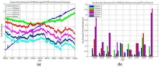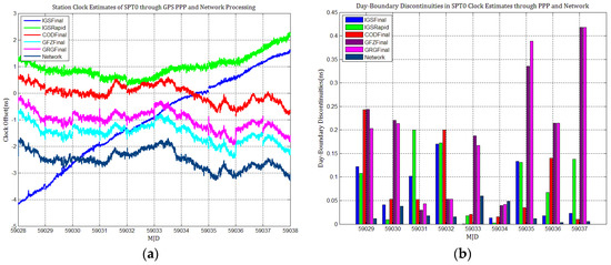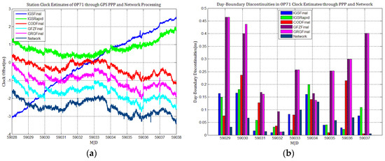 (a) Station clock estimates of OP71 through GPS PPP and network solutions; (b) day-boundary discontinuities in clock estimates.