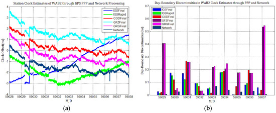(a) WAB2 station clock estimates through GPS PPP and network solutions; (b) day-boundary discontinuities in clock estimates.