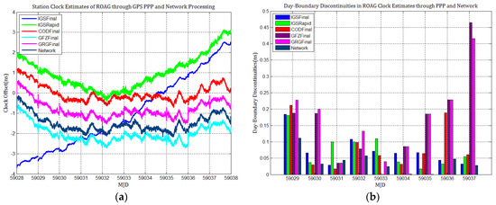 (a) ROAG station clock estimates through GPS PPP and network solution; (b) day-boundary discontinuities in clock estimates.