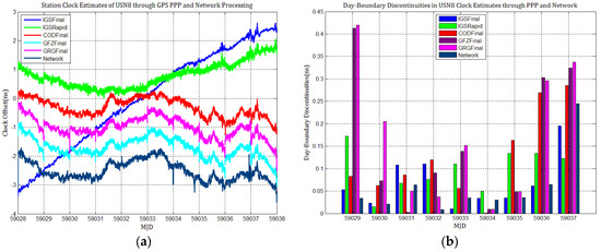 (a) USN8 station clock estimates through GPS PPP and network solution; (b) day-boundary discontinuities in clock estimates.