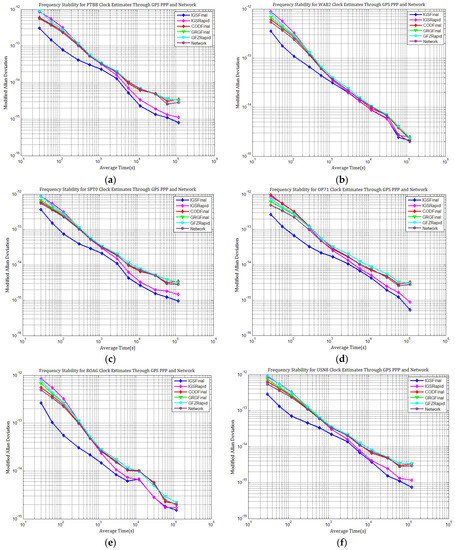 For comparison, the level of day-boundary discontinuities in station clock estimates through the network solution is roughly less than those in the PPP results, except for station clocks at MJD 59033 and MJD 59035 epochs. As discussed in Section 2, PPP highly relies on clock products, whereas the network solution does not. Although IGSFinal and IGSRapid have the smallest daily discontinuities and are superior to the network clocks, the day-boundary discontinuities are smaller in station clock estimates obtained with network solutions. The day-boundary discontinuities in PPP station clock estimates were found to be related to the discontinuities in ACs GPS clock products. The discontinuities in these products seem to cause new errors during station clock estimates and increase the day-boundary discontinuities. By comparing Figure 3b, Figure 4b, Figure 5b, Figure 6b, Figure 7b and Figure 8b, with Figure 1, the changes in day-boundary discontinuities at different adjacent epochs seem to be correlated with the visible satellites at midnight. If the satellite clock during observation at midnight shows large discontinuities, a considerable level of day-boundary discontinuities may be observed in the PPP results. The discontinuities in precise products may be due to the discontinuities in the orbit or non-perfect overlapping strategies employed by different IGS ACs for clock generation and solution noise. Station clock estimates are likely to inherit these noises. As mentioned in Section 2.2, CODE adopts double-differenced network processing of phase observations with a 3-day-arc to estimate satellite orbits. Overlapping strategies of orbits at the boundaries superior to strategies adopted by undifferentiated GFZ. CNES-CLS employs an overlapping 6 h of data from the neighboring days to eliminate discontinuities in orbits. However, it is necessary to identify along-track orbit errors, solar radiation pressure (SRP) model errors, and other systematic or geophysical errors. Figure 3b, Figure 4b, Figure 5b, Figure 6b, Figure 7b and Figure 8b, also show that the day-boundary discontinuities are highly site-dependent due to the changes in the daily discontinuities with epochs in different station clock estimates. Although this may be caused by local code multipath errors and the temperature around the receivers, this experiment cannot indicate the problem. However, we still conclude that the day-boundary discontinuities are related to the ACs GPS products, and the daily discontinuities in ACs GPS precise products will influence the origin of the day-boundary discontinuities in PPP station clock estimates. This can be illustrated by the station clocks’ frequency stability in Figure 9a–f. Fortunately, the magnitude of the induced day-boundary discontinuity is so small that its impact can be ignored.