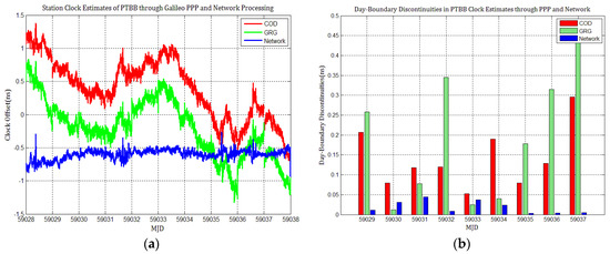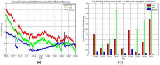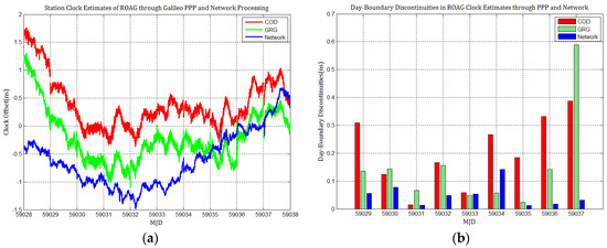 (a) ROAG station clock estimates through Galileo PPP and network solution; (b) day-boundary discontinuities in station clock estimates.