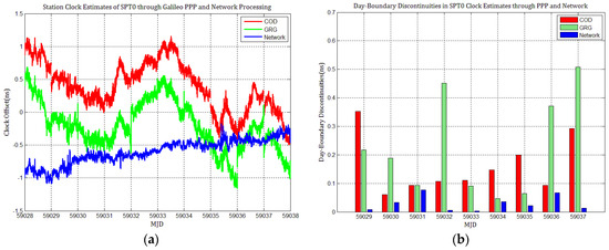 (a) SPT0 station clock estimates through Galileo PPP and network solution; (b) day-boundary discontinuities in station clock estimates.