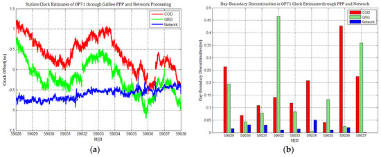 (a) OP71 station clock estimates of through Galileo PPP and network solution; (b) day-boundary discontinuities in station clock estimates.