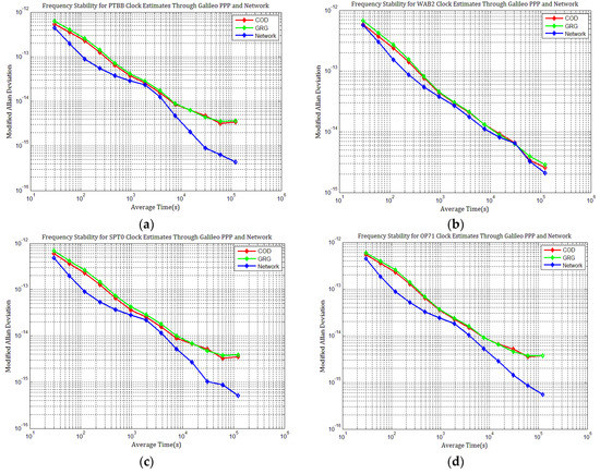 Figure 16 shows that the instabilities in the clock estimates for each station differ given the products employed and are affected by the day-boundary discontinuities. The frequency stabilities of all station clocks obtained by network solutions are superior to those obtained by PPP with Galileo COD and GRG products at an average time of one day. The inferred instability can be higher than 5 × 10−15 for the station clock of H-maters at the average time of one day, and all the station clocks’ instabilities can approach this performance level with COD and GRG products. Additionally, the frequency stabilities of all station clocks obtained with COD and GRG products are nearly the same. This illustrates that PPP station clock estimates are not significantly affected by products with little difference in the daily discontinuities. Random-walk noises can be observed in the long-term frequency of all clock estimates with COD and GRG products, seriously degrading station clocks’ long-term frequency stability, especially at an average time of more than one day. This agrees with our conclusion that the discontinuities in Galileo products may influence the frequency stability of PPP station clock estimates.