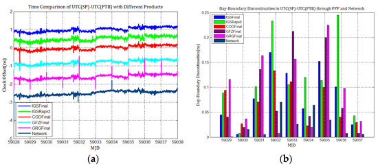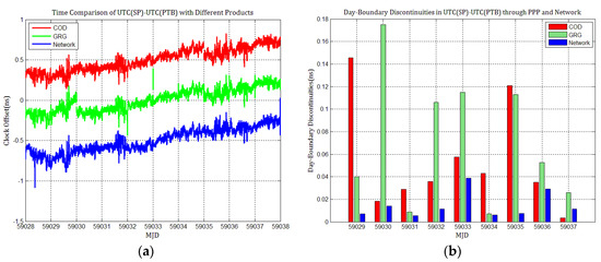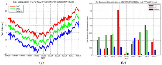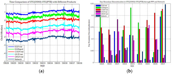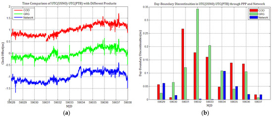 (a) Time comparison of UTC(USNO)– UTC(PTB) through Galileo PPP; (b) day-boundary discontinuities in time comparison.