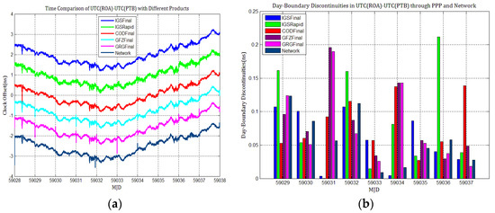 (a) Time comparison of UTC(ROA)−UTC(PTB) through GPS PPP; (b) day-boundary discontinuities in time comparisons.
