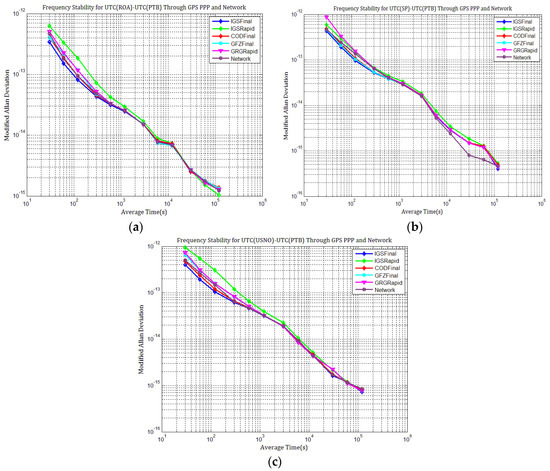 Frequency stability of UTC(SP)–UTC(PTB), UTC(ROA)–UTC(PTB), and UTC(USNO)–UTC(PTB) through GPS PPP with different products: (a) MDEV of UTC(SP)–UTC(PTB); (b) MDEV of UTC(ROA)–UTC(PTB); (c) MDEV of UTC(USNO)–UTC(PTB).