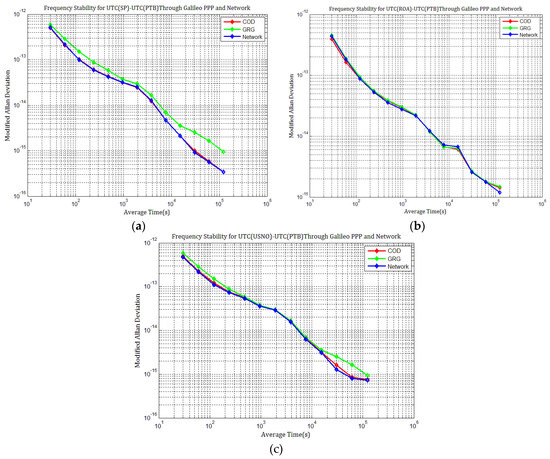 Frequency stability of UTC(USNO)–UTC(PTB), UTC(ROA)–UTC(PTB), and UTC(USNO)–UTC(PTB) through Galileo PPP with different products: (a) MDEV of UTC(SP)–UTC(PTB); (b) MDEV of UTC(ROA)–UTC(PTB); (c) MDEV of UTC(USNO)–UTC(PTB).