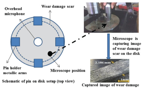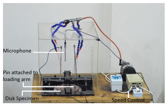 For this purpose, recently, Kong et al. described the methods of online tool wear monitoring. They used Kernel principal component analysis to fuse the sensitive tool wear signals. They constructed a predictive model for tool wear based on support vector regression and correlated the fused signal and the actual tool wear. The results showed that the prediction accuracy was close to 100% [21]. Another study used Titanium cylindrical flat pins over a Silicon carbide abrasive disc under dry sliding conditions [22]. It used the Taguchi method to predict wear behavior against variable load, speed, sliding duration, and signal-to-noise ratio. The obtained results showed a good correlation of wear and acoustic emissions under variable operating conditions, and a predictive model based on linear regression equation was also developed. Contact based signals were also studied under the effect of lubrication in the past [23,24,25]. Recently, researchers showed the possibility of the trend modeling between acoustic emissions and the wear in terms of accumulated signal energy and changes in spectrum amplitude [9,25,26,27,28,29]. However, most of these efforts used a single pin/point contact sensor and analyzed the spectrum of noise with different speed, sliding distance, and temperature values.