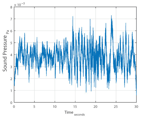 The evolution of the mean of a 30 s long measurement, computed using a moving average, is plotted against time in Figure 3. Figure 4 shows the computed ACS against the lag indexes for the same measurement. Figure 5 displays the same ACS with the lag index limited to . Observing the three figures, we can conclude that: