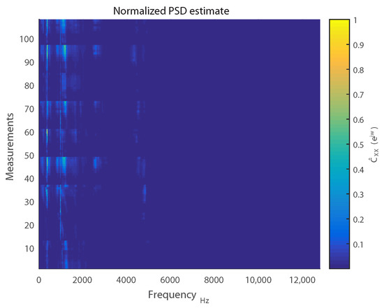 Given the result of the stationarity analysis, the power spectral density (PSD) can be estimated. According to the Wiener–Khinchin theorem, the PSD is the squared discrete Fourier transform (DFT) of the ACS of each measurement signal [35]. The conventional periodogram estimator is considered analogous to this definition [36].