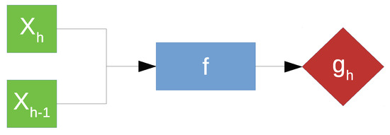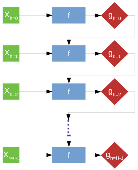For subsequent discussion, let h denote the time horizon, with and corresponding to the surface wear and spectral features of the measurement at horizon h. The model for predicting surface wear estimates can be expressed as f. A common solution for a forecasting problem is the recursive approach, which involves the prediction being fed back to the model, hence the name, as part of the input for prediction of the target belonging to the next time horizon [42]. However, this approach, illustrated in Figure 8, is extremely sensitive to prediction error due to error propagation [43].
