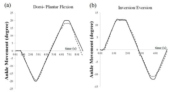 Ankle kinematic measurements using the AMT are reliable compared to 3D kinematics using the Vicon motion capture system during passive bi-axial ankle movements (Figure 2). Our results therefore suggest that the AMT could be an effective instrument to evaluate ankle stiffness for designated ankle postures during passive movements. While the ankle joints are performing dorsiflexion, for example, the joint torque would increase more than in a neutral ankle position, causing greater stiffness along the talocrural axis in the AMT [11]. Thus, the AMT is able to evaluate posture-dependent nonlinear ankle stiffness along the full ROM of each ankle joint. Moreover, it may be possible to measure speed-dependent dynamic ankle stiffness by changing the movement speed of the AMT.