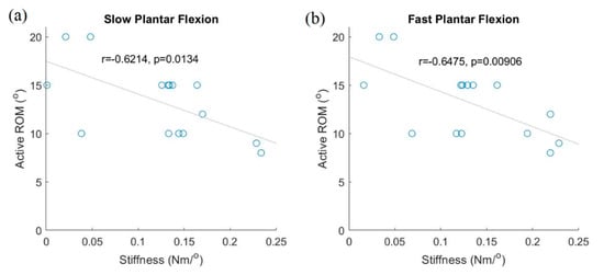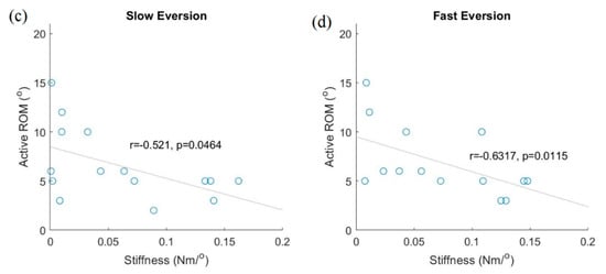 When the ankle achieved the designated plantar flexion during slower movements, the stiffness along the talocrural joint showed a significantly negative correlation with the active ankle ROM (Figure 3, slower movement: r = −0.621, p = 0.013; faster movement: r = 0.6475, p = 0.009). Although active dorsiflexion ROM showed no significant correlation with stiffness along the talocrural joint for faster dorsiflexion movements, stiffness along the talocrural joint showed a significant positive correlation with active dorsiflexion ROM. When the ankle was in the designated eversion position during slower/faster movements, stiffness along the subtalar joint showed a significant negative correlation with active ankle ROM (slower movement: r = −0.521, p = 0.046; faster movement: r = −0.632, p = 0.011).