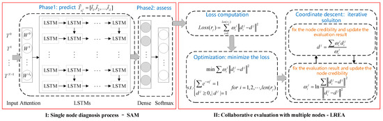 It is possible to assess all nodes in the local region by prediction, diagnosis and then integrate these nodes’ assessment results to evaluate how their corresponding regions operate. However, different single nodes may be varying in credibility, due to factors such as network transmission, environmental impact, and nodes themselves. If all nodes are treated with no distinction, it will obtain the evaluation results that deviate from actuality through integrating the assessment results of all nodes. To obtain more accurate evaluation results for a local region, a local region evaluation algorithm based on node credibility (LREA) was proposed. Note that different nodes in the same local region have inconsistent evaluation results and different nodes’ credibility. Therefore, the local region evaluation is converted into a matter about how to optimize the node credibility and assessment results. On that premise, the coordinate descent method can be used to calculate a local region evaluation result. The processing flow diagram is shown in Figure 6.