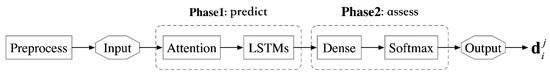 Given the fact that the data on a time sequence of single nodes are non-smooth, unstable, with noisy and missing values in actual operation, we propose the single-node assessment model based on multiple relevant sequence (SAM). Within SAM, the data on the time sequence of nodes are pre-processed and normalized, so that cosine similarity can be used to compute the relevancy of the sequence; select multiple correlation sequence as inputs and add the attention layer to assign multiple sequences with attention weights; adopt the LSTM layer to make a prediction and complete the assessment of a single node through the Softmax layer. The structure of the SAM is shown in Figure 3. The single-node evaluation process includes two stages.