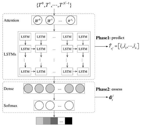 - Prediction of single node. A related prediction is completed by using the attention layer and the LSTM layer. Considering that each sequence’s input bears varying magnitudes of importance in the prediction process, the attention layer is employed to assign each sequence with a weight: . With the attention weights applied to the inputted sequence, we can obtain as the inputs on the LSTM layer. Weights are updated through error backpropagation. Predictions on the LSTM layer led to the predicted value of the sequence. For the node , its prediction error can be obtained through the root-mean-square deviation between the original time sequence and the predicted value of such sequence .