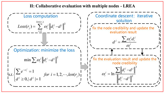 The process of the iterative solution with the coordinate descent method takes place in two steps. Step 1: fix the node credibility and update the local region evaluation result. Step 2: fix the local region evaluation result and update the node credibility. Each round of iteration pushes the optimization problem closer to the optimal solution. The above two steps need to be executed alternately until the final convergence is realized.