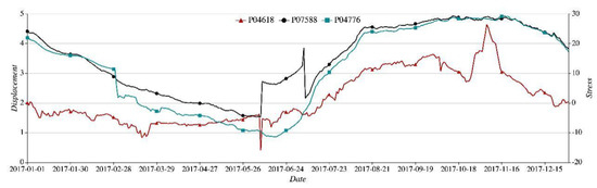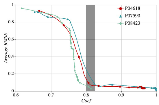 In Figure 16, the horizontal and vertical axes represent the correlation coefficient (Coef) and the average RMSE, the legends of the solid circle, triangle, and rhombus correspond to the nodes P04618, P07590, and P08423, respectively. Overall, the average RMSE curve goes down as the Coef increases. As displayed by the grey column in the figure, when the Coef threshold ranges between 0.8 and 0.825, the average RMSE will dive. Since more sequence Coefs are input, the single node prediction will see a more significant enhancement. However, at the time when the Coef threshold grows to a certain number, for instance about 0.9, the average RMSE will decrease at an increasingly flattened range. Therefore, the Coef threshold of 0.82 is set for the dam monitoring data set used in the experiment.