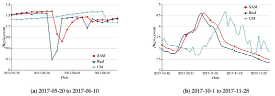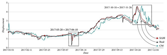 Taking the two periods of time marked with the dotted box, that is, 28 May 2017–4 June 2017 and 10 October 2017–28 November 2017 we find that the SAM, CM, and Real curves are divergent from each other greatly. The details can be seen in Figure 11a,b.