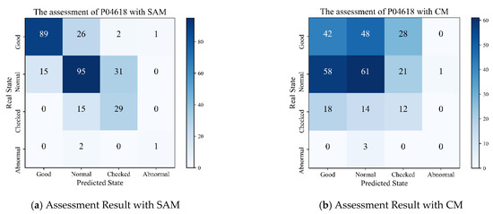 SAM and CM assess a single node’s operation state using the predicted values and real values of the node. Let us take the predicted values and real values of the node P04618 from 1 January 2017 to 28 February 2017 as a historical sample to assess the node’s operation state from 1 March 2017 to 31 December 2017 (the assessment result may be any of the following four options: “Good,” “Normal,” “Checked” or “Abnormal”). The assessment results with SAM and CM are presented in the form of a confusion matrix as Figure 13a,b. The number of days under assessment totals 306. The horizontal and vertical axes represent the predicted state and the real state, respectively.