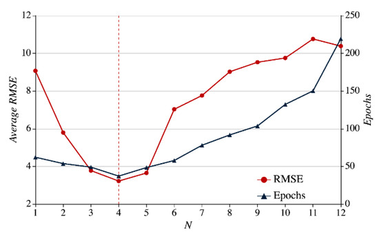 When SAM is used for prediction and assessment, the number of correlation sequence N will affect the prediction accuracy rate and the number of convergence epochs. In the prediction of 31 nodes available within the single region from 1 January 2017 to 31 December 2017 we increase the number of correlation sequence N from “1” to “12,” and make statistics of each node’s average RMSE and average convergence epochs. The experiment results are shown in Figure 14 where the horizontal axis represents the number of correlation sequences, the left y-axis means RMSE and corresponds to the legend of the dot, and the right y-axis indicates the average iteration epochs and corresponds to the legend of the triangle.