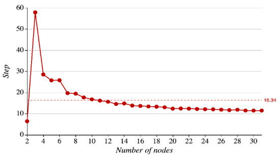 In Figure 17, the horizontal and vertical axes represent the number of nodes (2–31) and the number of average convergence steps, respectively. As seen in the figure, when the number of nodes is 2, the number of average convergence steps is 6.42; when the number of nodes is 3, the number of average convergence steps will reach its peak: 57.92; when the number of nodes grows from 3 to 10, the number of average convergence steps drops rapidly, approaching the average value of 16.34; when the number of nodes exceeds 10 and continues to increase, the number of convergence steps falls at a slight and steady pace and hits its lowest level of 11.48 at the time when there are 30 or 31 nodes. In the dam safety monitoring systems, nodes usually come in a large number (more than 10), so LREA can converge fast.