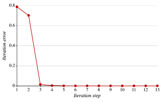 Suppose that the iteration threshold is and the number of iterations is 100. The average iteration error will change as shown in Figure 18. In the figure, the horizontal and vertical axes represent the number of iteration steps (1–13) and the iteration error, and the number of average convergence steps is 13. As shown in the figure, the iteration error plunges as the number of iteration steps increases from “1” to “3,” which evidences that LREA can get stabilized and converge rapidly.