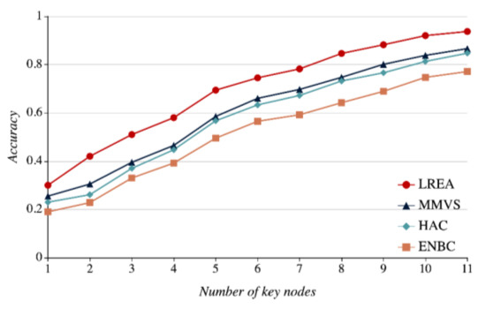 Relations between the number of key nodes and evaluation accuracy rates.