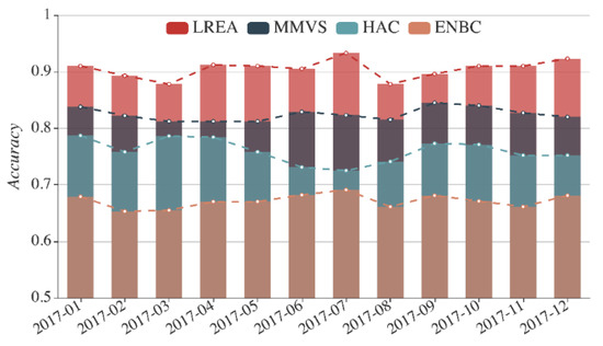 In Figure 20, the horizontal axis encompasses different months, the vertical axis indicates the monthly average evaluation accuracy rates, the four tops of each colored column represent the accuracy rates of the four methods. Taking July 2017 as an example, we can see that the four columns in different colors from high to low correspond to LREA, MMVS, HAC, and ENBC, with the accuracy rates standing at 93.3%, 82.3%, 72.5%, and 69.1%, respectively. Overall, the four methods are ranked by the accuracy rates in descending order: LREA, MMVS, HAC, and ENBC. The annual accuracy rates of evaluation results obtained with LREA, HAC, ENBC, and MMVS come at 90.5%, 82.5%, 76.0%, and 67.1%.