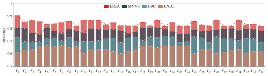 With the real data on the dam under monitoring from 1 January 2017 to 31 December 2017, we compare LREA with the currently used three methods: HAC, ENBC, and MMVS. The monthly average evaluation accuracy rates of the local region attained with the four methods are illustrated in Figure 20, and the annual average evaluation accuracy rates of the 34 local regions ( to ) with the four methods can be seen in Figure 21.