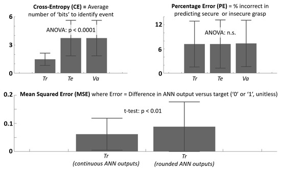 Mean values shown for artificial neural network (ANN) training parameters (CE, PE, two versions of MSE). Results for CE and PE shown for training (Tr), testing (Te), and validation (Va) data sets. Minimization of CE was objective function during training. Computation for MSE during training shown for continuous ANN output (any value over [0, 1]) versus rounded ANN output (ANN output converted to either ‘0’ or ‘1’ if continuous output is > or <0.5, respectively). Note: p-value > 0.05 is not significant (n.s.).