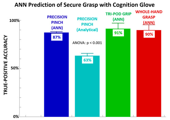 True positive rate detection of secure grasp depended if ANN utilized for prediction of precision pinch, tri-pod grip, or whole-hand grip versus analytical (cancellation) method utilized for precision pinch.