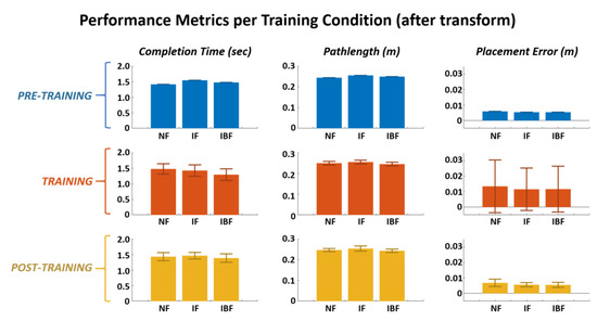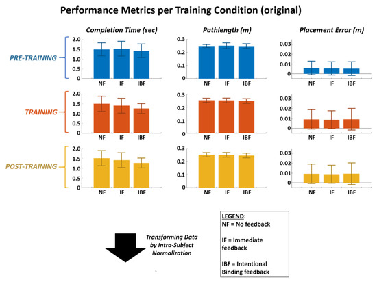 Figure 5 shows examples for three distinct subject-cases whereby a given subject may exhibit a unique combination of intra-training rates across the three training feedback modes. Figure 6 and Table 4 show results for the two outcome measures for intra-training and post-training effects. Significant differences (p < 0.05) were observed across feedback groups for both completion time and pathlength for both intra-training rate and post-training effect. While IF only demonstrated significant improvement over NF for intra-training completion time, IBF demonstrated significant improvement over NF for intra-training completion time, intra-training pathlength, post-training completion time, and post-training pathlength. No significant differences were observed related to placement error.