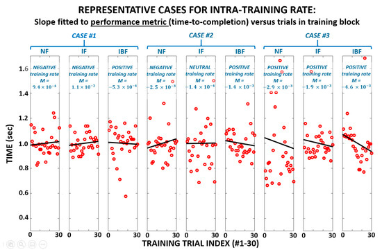 Example of linear regression fits to performance data of a single metric (completion time) shown across thirty sequential training trials for each of three feedback training conditions. Each ‘case’ represents the same subject with a distinct combination in trends of the regression slopes, i.e., intra-training rates. A ‘positive’ (desirable) intra-training rate is a decline in the performance metric value, i.e., slope < 0. Note: Training feedback groups: NF = No Feedback, IF = Immediate Feedback, IBF = Intentional Binding Feedback