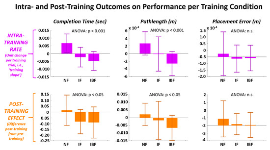 While the ANOVA results on outcome measures indicate significant differences among feedback groups, Table 5 demonstrates whether the outcome measures were significantly non-zero. Only IBF demonstrated significant improvements in performance (i.e., reductions in metric values) from zero, and did so for intra-training completion time, intra-training pathlength, post-training completion time, and post-training pathlength. It is notable that NF did demonstrate a significant decrease in performance (i.e., increase in metric value) from zero for intra-training rate for completion time and pathlength. This result for NF demonstrated the need to show significant differences for IF and IBF not only against NF, but also a zero-reference.