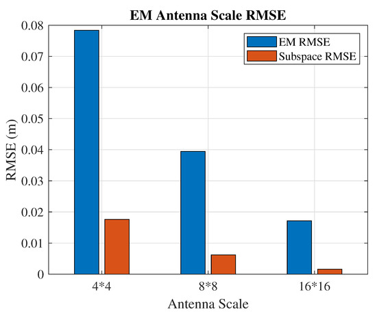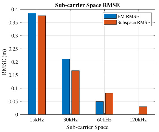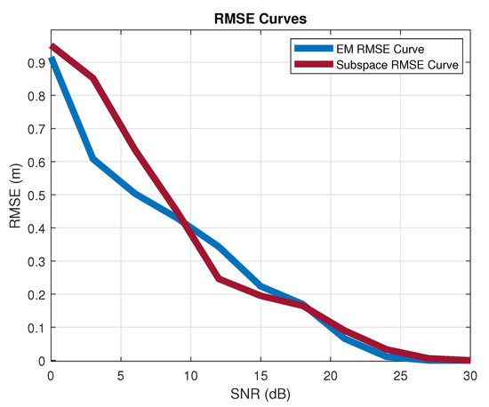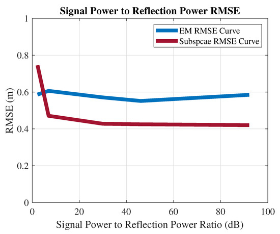 - RMSE vs. power: The total bandwidth is 60 MHz, and the SRS uses 2.88 MHz. The reflection signal is set at a fixed range m and the angles. The EM and subspace algorithms’ positioning RMSEs versus different signal power-to-reflection power ratio (SPRP) levels are collected in Figure 8. The EM estimation accuracy decreases with the power of the reflection. However, the influence of the SPRP on the subspace algorithm is more severe (constantly around 0.6, as shown in Figure 5, as the subspace algorithm is more sensitive to the correlated sources.